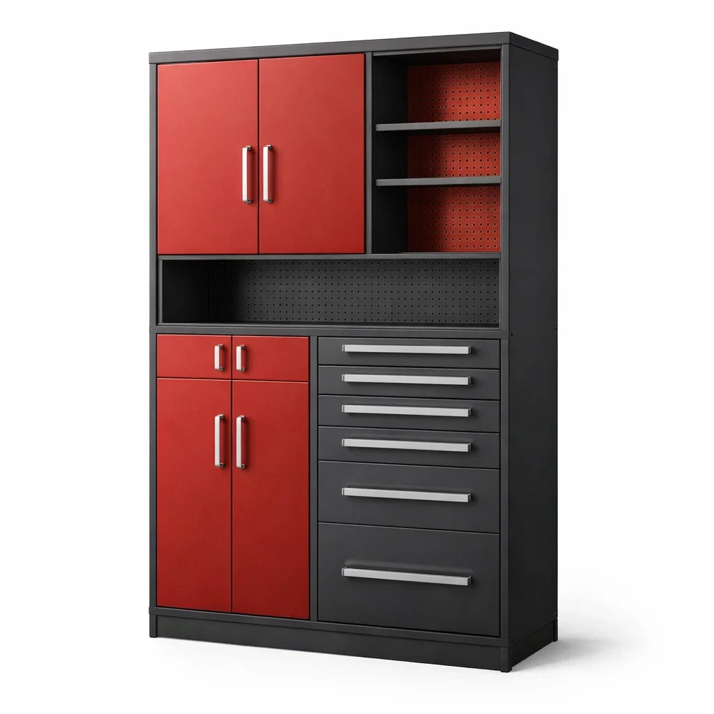 Werkzeugschrank aus Stahl mit einer pulverbeschichteten Oberfläche. Enthält 4 Türen, 6 Schubladen und 3 offene Stauräume. Griffmaterial aus Metall. Maße: 200 cm Höhe x 120 cm Breite x 40 cm Tiefe. Gesamtgewicht beträgt 85 kg. Abgerundete Ecken für zusätzliche Sicherheit.
